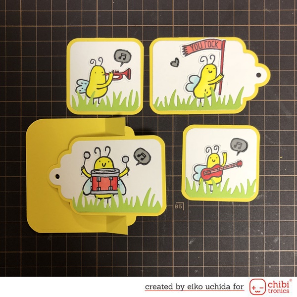 Stamp six bugs onto white cardstock and color the bugs with Copic markers.